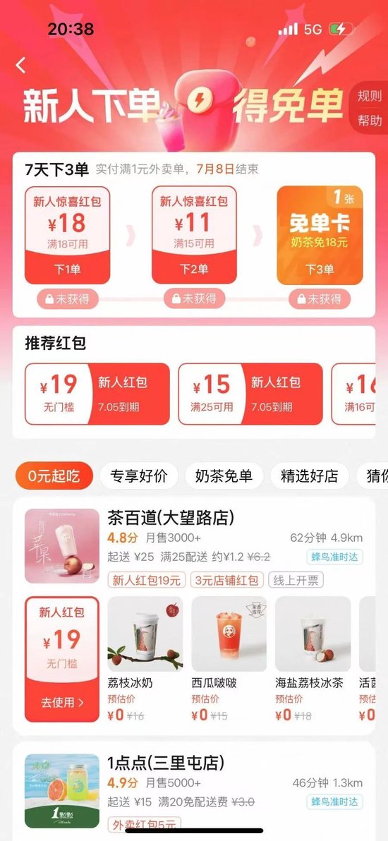 两大平台放出了大量且大额的外卖红包券,其中包括“满25减24”“满15减15”“满22减18”等多张无门槛外卖券。淘宝闪购平台推出了“满18减18”的新人专享红包,美团也联合不同奶茶饮品品牌推出了“0元喝奶茶”的平台福利活动。