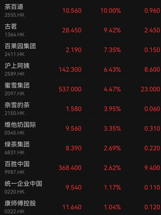 受到大量订单的刺激,7月7日,茶饮股全线高开,茶百道一度大涨15%,截至发稿,茶百道涨10%,奈雪的茶涨3.95%,古茗涨9.42%,沪上阿姨涨6.43%,蜜雪集团涨4.47%。