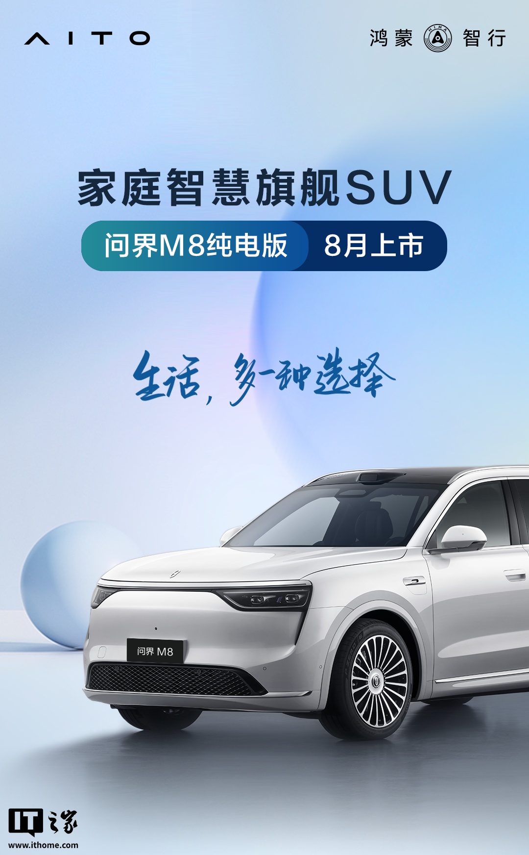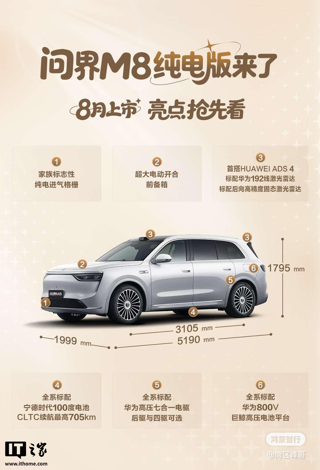 《鸿蒙智行问界 M8 纯电版汽车 8 月上市:首批搭载 HUAWEI ADS 4、首发华为高压七合一电驱》